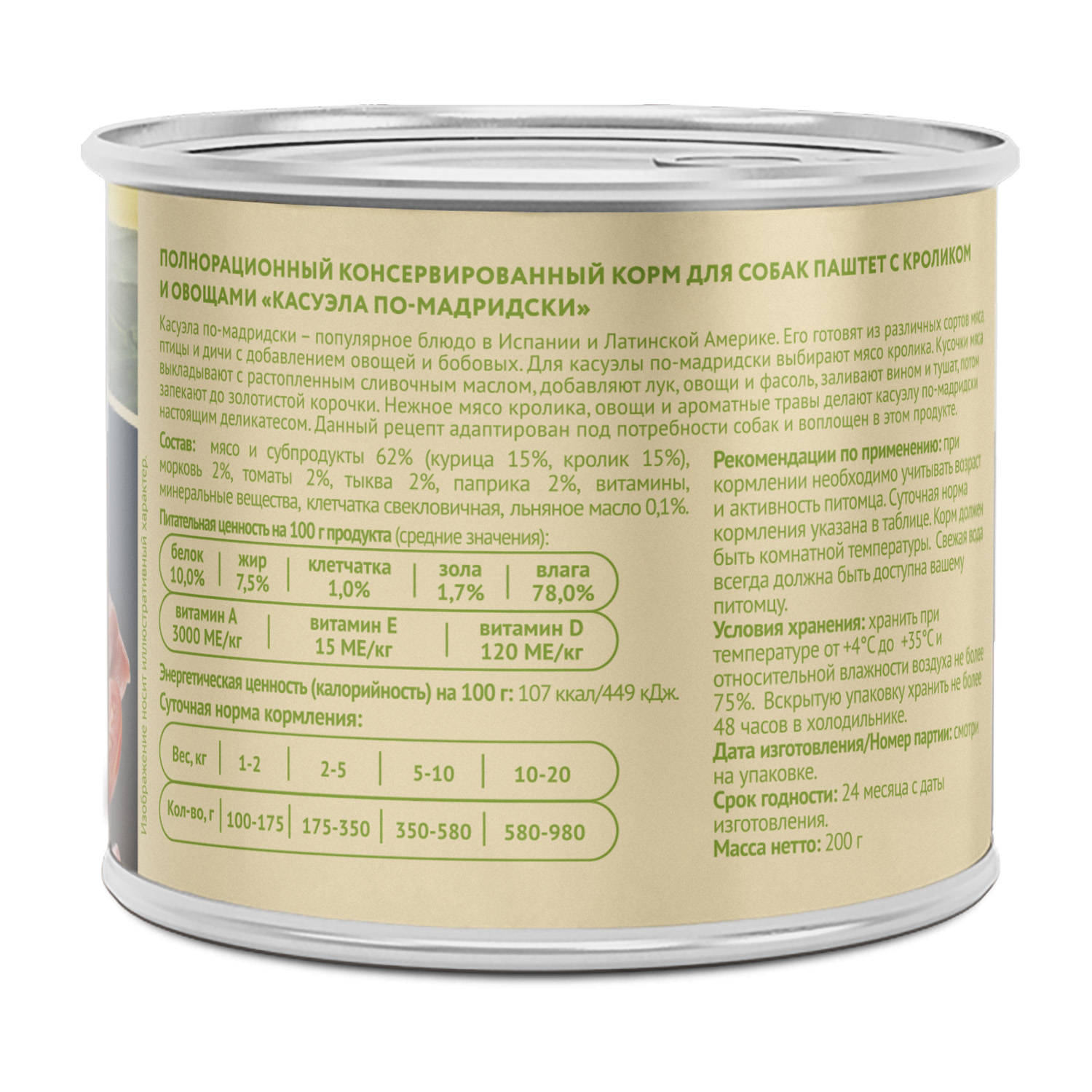 Полнорационный консервированный корм для собак "Касуэла по-мадридски". Паштет с кроликом и овощами.