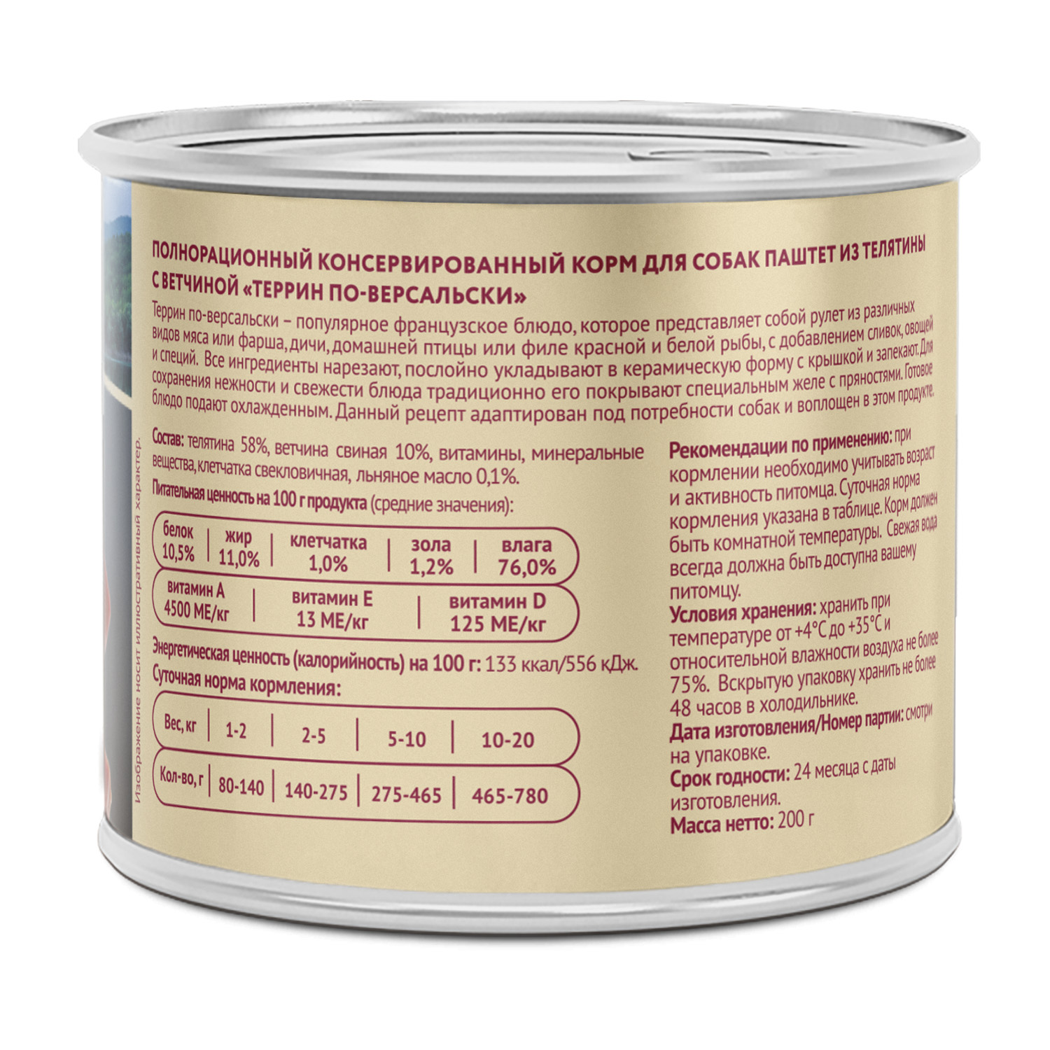 "Полнорационный консервированный корм для собак ""Террин по-версальски"". Паштет из телятины с ветчиной.