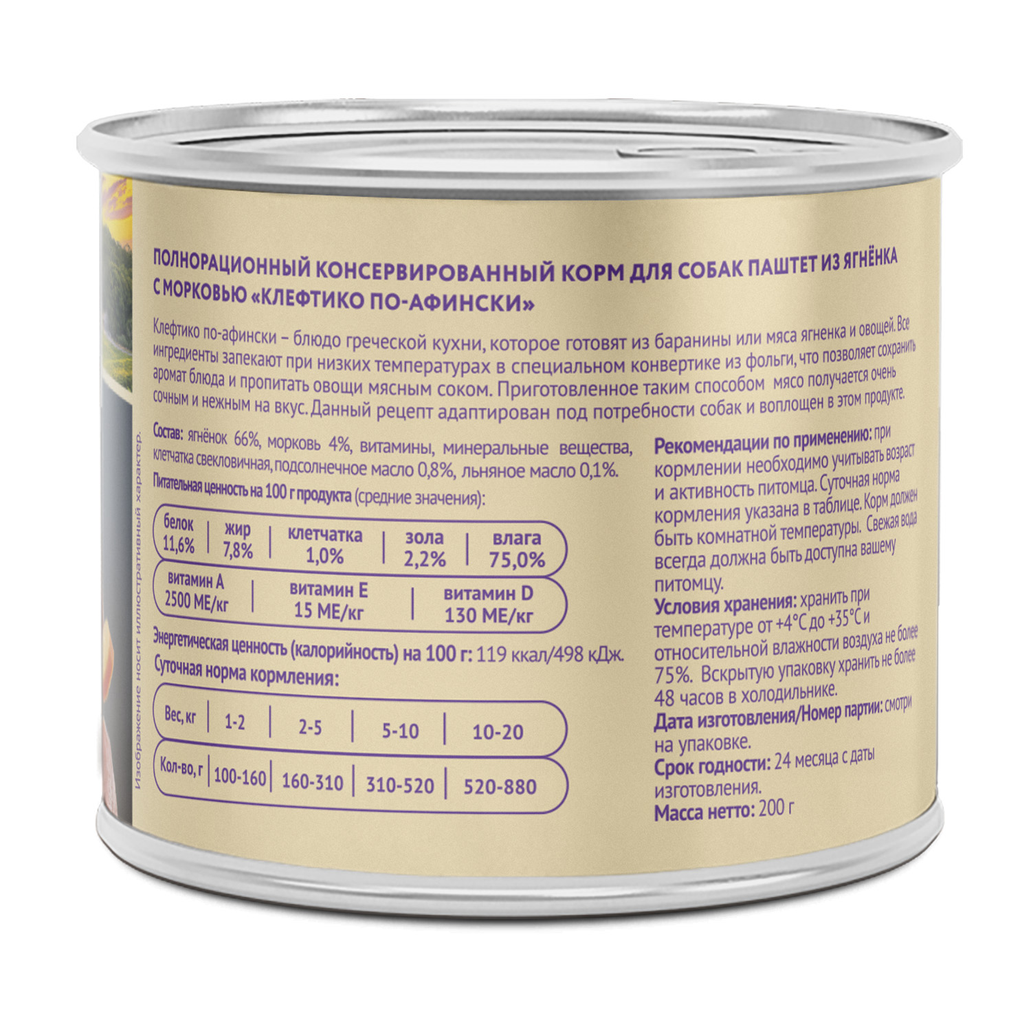 Полнорационный консервированный корм для собак "Клефтико по-афински". Паштет из ягнёнка с морковью.