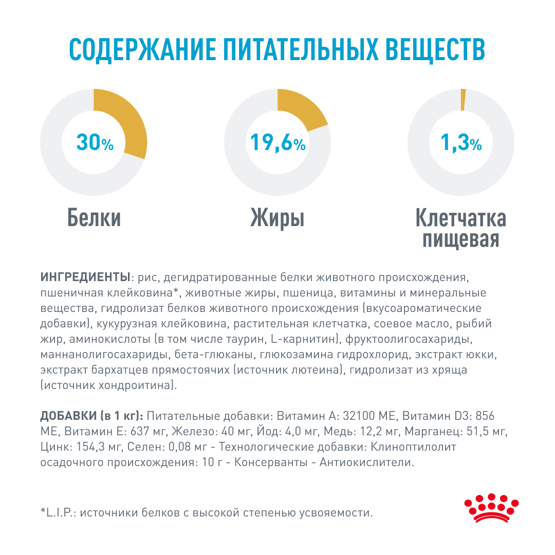 Комплекс питательных веществ, включающий высококачественные белки (L.I.P.*) и пребиотики (фруктоолигосахариды), благоприятно воздействует на пищеварительную систему, поддерживая баланс кишечной флоры и оптимальную консистенцию стула.